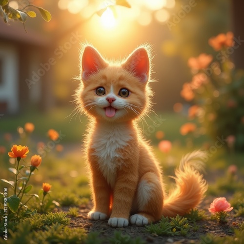 An orange kitten sitting in the grass with its tongue out, surrounded by plants with flowers and leaves, with a blurred background.