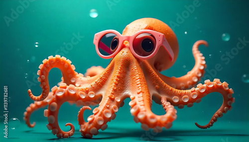 An orange octopus wearing large pink sunglasses against a teal background, a Summer feeling, a beach scene with an octopus wearing sunglasses underwater, created with generative ai