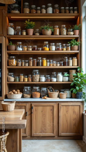 An organized kitchen pantry filled with various jars and baskets showcasing sustainability and ecological values.