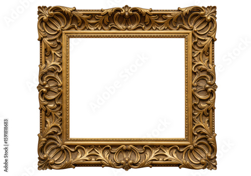 An ornate, antique golden picture frame with intricate carvings and a decorative border, isolated on a transparent background