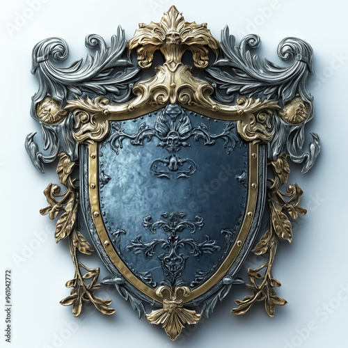 An ornate metallic shield badge with intricate designs, perfect for heraldic themes, decorations for medieval events, or awards ceremonies.