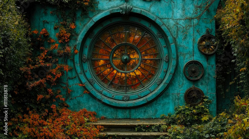 An ornate turquoise door rests in a lush, ivy-covered area, framed by vibrant autumn leaves, hinting at hidden secrets within the forest