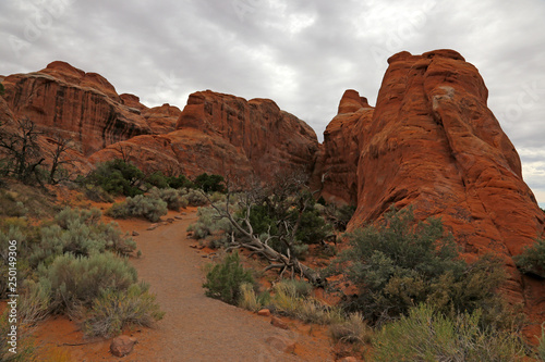 An overcast shot of the trail in Devils Garden in Arches National Park, Utah.