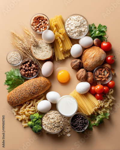 An overhead shot displays a circular arrangement of diverse food items, including pasta, grains, eggs, nuts, and produce on a solid beige background for nutrition.