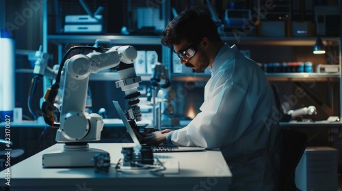 An over-the-shoulder photo of a robotics engineer working with a laptop computer and software operating a robotic arm. Robot hand holding a microchip. Automation Startup Research and Development