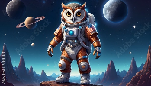 An owl wearing a spacesuit with a helmet jetpack and moon boots against a starry night sky background with planets and galaxies