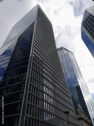 An ultra-modern skyscraper reaching into the cloudy skies in London. This shows a generic, modern, glass skyscraper among clouds and similar buildings.