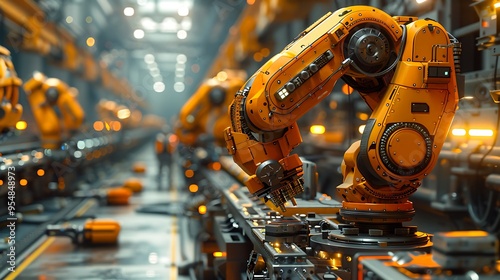 An ultra-realistic scene of a human technician and robotic arm working in perfect harmony to assemble a complex component on a production line. The factory is filled with advanced technology,