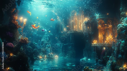 An underwater palace with a golden glow.