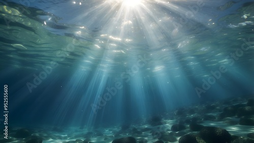 An underwater shot with sunlight filtering down through the waves, illuminating the deep blue sea and casting beams of light that dance on the ocean floor