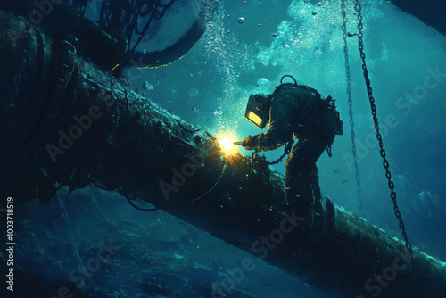 An underwater welder is diligently performing repairs on a submerged structure. Bubbles rise as welding equipment emits a bright spark, illuminating the dark water surrounding the worker.