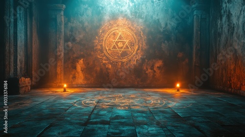 An unsettling room with strange, unexplained symbols drawn on the floor, dim candlelight flickering in the background, and ample copy space surrounding the scene