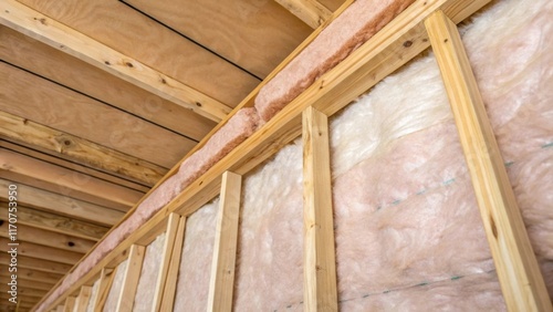 An upclose examination of the edges where the fiberglass batt insulation meets the wooden framing. The insulation is precisely resulting in a clean line along the studs. A small