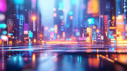 An urban city street filled with different small businesses, each having digital floating location markers and real-time customer reviews visible, illustration style, vibrant colors, futuristic c