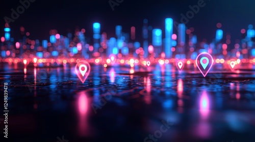 An urban city street filled with different small businesses, each having digital floating location markers and real-time customer reviews visible, illustration style, vibrant colors, futuristic c