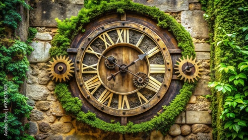 Analog clock face with intricately designed gears and Roman numerals on a worn stone wall, surrounded by lush greenery, symbolizing the passage of time.