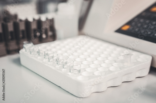 Analysis. Set of transparent medical tubes lying on laboratory table against modern equipment