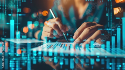analysis working with the latest financial results. Analysis of sales forecast graphs, financial accounting with hand writing Abstract digital effect for background