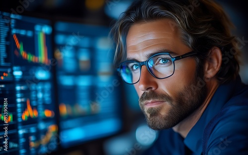 Analyst reviews data, night office, charts
