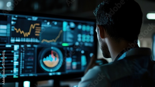 Analyst views data and stock market charts on screen in dark office