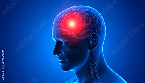 Anatomical illustration of a human head with a highlighted area in the brain, rendered in blue tones.
