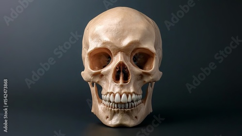 Anatomical skull model with teeth displayed on a dark gray background in a studio setting showing detail