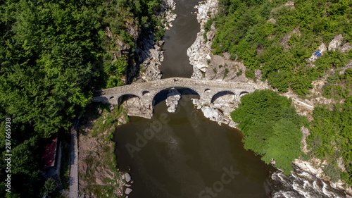 Ancient bridge in the mounbtains with reflection in the water. Devil's bridge - Bulgaria