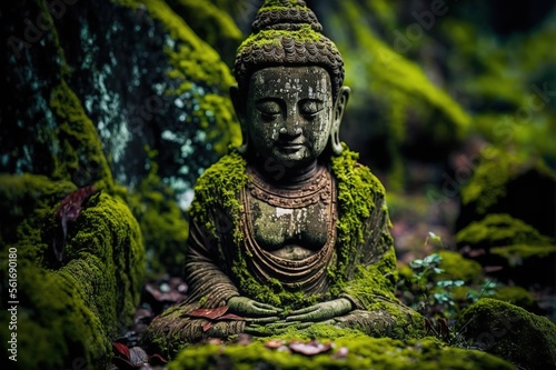 ancient buddha sculpture in the green rain forest, photo-realistic illustration of buddha statue, generative AI