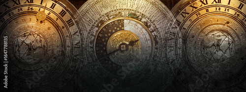 Ancient calendar with constellations and astronomical instruments against the oold paper background. Symbol of science, astronomy, astrology, mystery, education, mysticism, numerology.