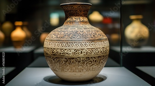 Ancient ceramic vessel with intricate carvings displayed in a museum showcase.