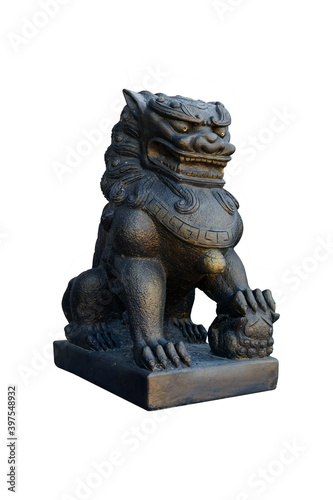 Ancient chinese lion statue stepping on glass ball isolated on white background with clipping path.
