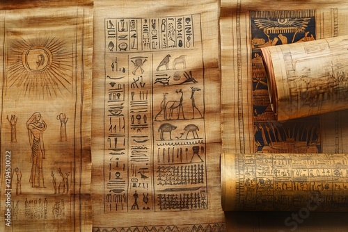 Ancient egyptian hieroglyphs and drawings on textured papyrus scrolls.