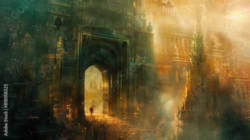 Ancient gateway amidst a futuristic cityscape, bathed in ethereal light, blending past and future