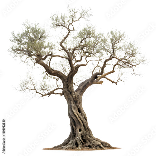 Ancient gnarled olive tree with twisting branches and delicate white foliage stands majestically