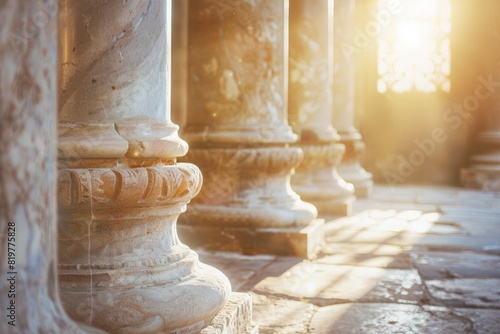 Ancient Greco-Roman hall interior with a circular stone podium surrounded by grand Corinthian columns. Beautiful simple AI generated image in 4K, unique.