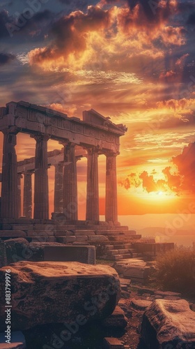 Ancient Greek temple ruins under a stunning sunset sky, showcasing historical architecture against a vibrant, colorful horizon.