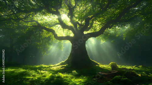 Ancient Oak Tree Bathed in Sunlight in a Lush Forest