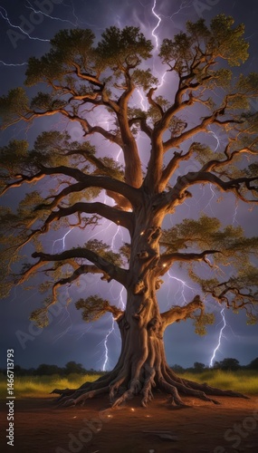 Ancient oak tree, crackling with multiple lightning bolts , leaves, ground