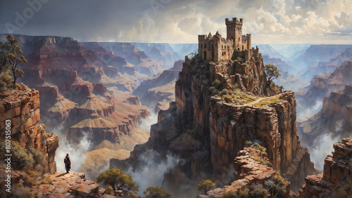 Ancient old fantasy castle ruins on a rocky cliff with eroded pathway, high above a grand canyon landscape, on the edge of the cliff stands a lone adventurer with a red hat and backpack.