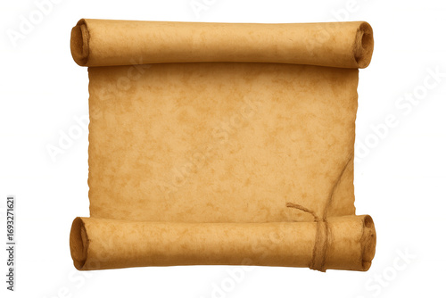 Ancient papyrus scroll tightly rolled, secured with twine, resting against transparent backdrop, evoking historical narrative and scholarly artifacts