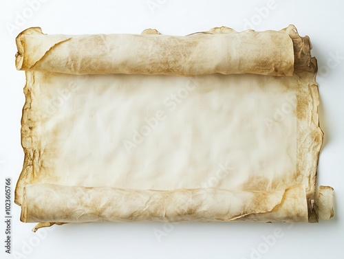 ancient parchment scroll unfurled on a pristine white background, suggesting wisdom and history, with an elegant, age-worn texture for an authentic feel