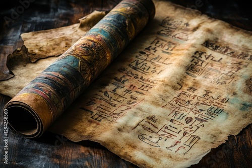 Ancient parchment scroll with hieroglyphs and vibrant illustrations shown.