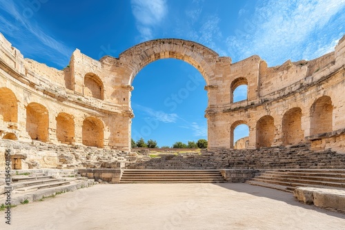 Ancient ruins of an amphitheater under a bright blue sky, showcasing historical architecture and stone craftsmanship.