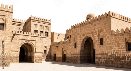 Ancient sandstone fortress with crenellated walls and arched entrances in a sunlit courtyard.