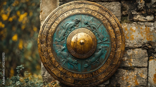 Ancient Shield: A close-up shot of a weathered, intricately designed ancient shield. The shield is mounted on a rustic stone wall, suggesting historical context and battle.