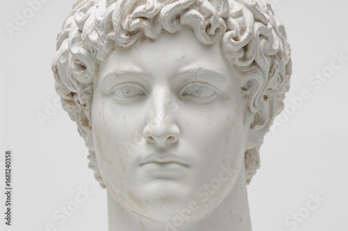 Ancient statue head replica made of white gypsum isolated on a white backdrop
