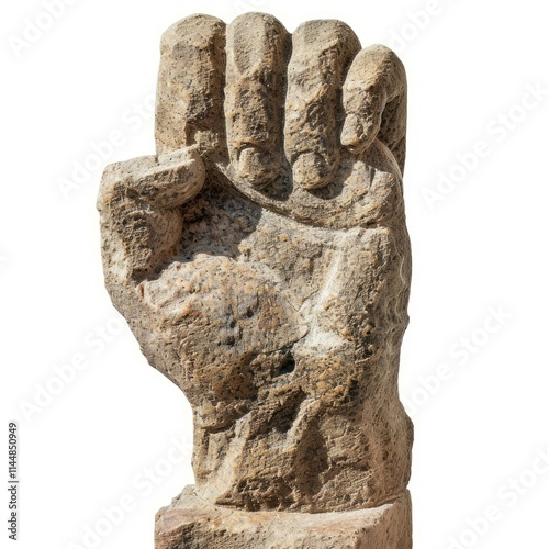 Ancient stone fist sculpture isolated on a white background, representing strength and power
