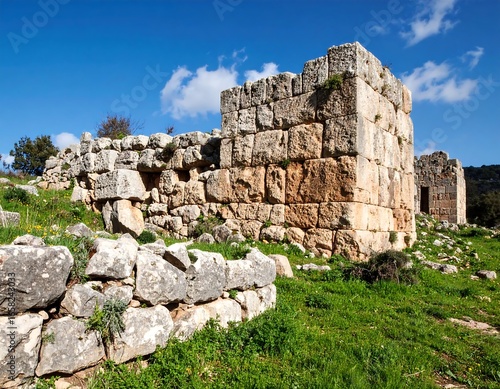 Ancient Stone Fortress Ruins Under a Bright Blue Sky with Fluffy Clouds.