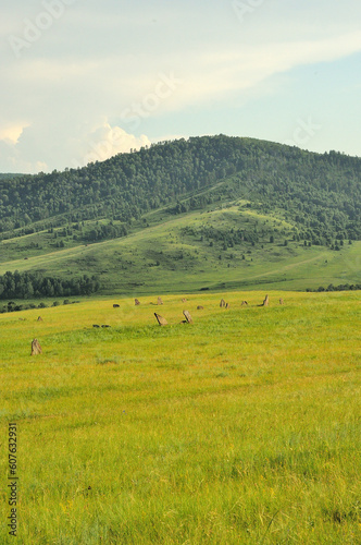 Ancient stone menhirs in a wide clearing overgrown with yellowed grass at the foot of a high mountain.