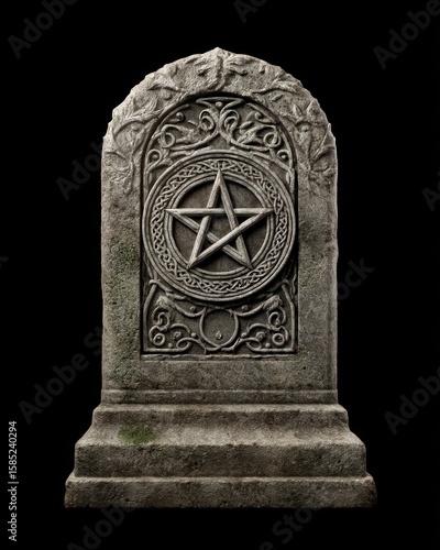 Ancient stone monument depicting a pentagram symbol against a stark black background for symbolic